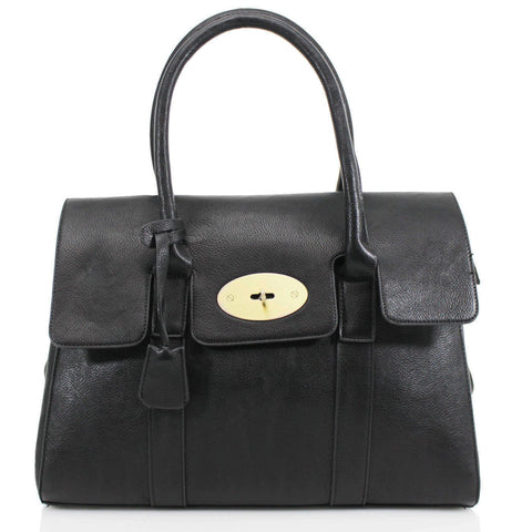 Double handle plus a long shoulder strap. Various zip compartments plus a zip closure under the flap & clasp.