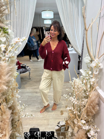 A knitted cardigan with heart detail on the sleeve and cute heart buttons.