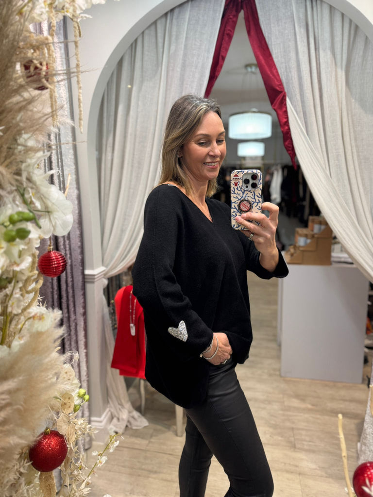 A soft v neck knit to fit a 16-24 with a glitter heart on each sleeve.