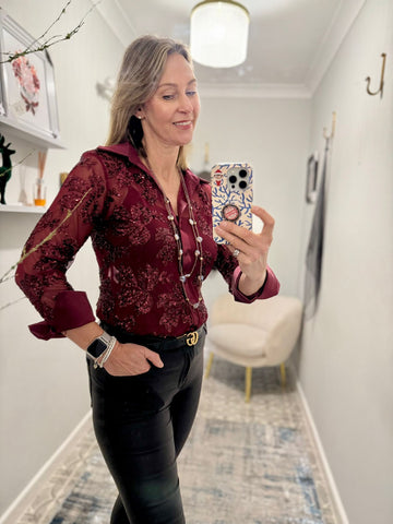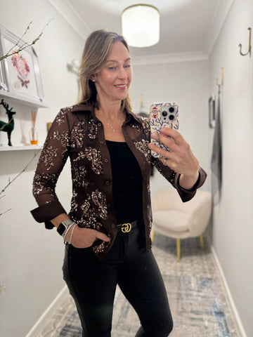 A beautiful sheer blouse with sequin detail and a satin collar.